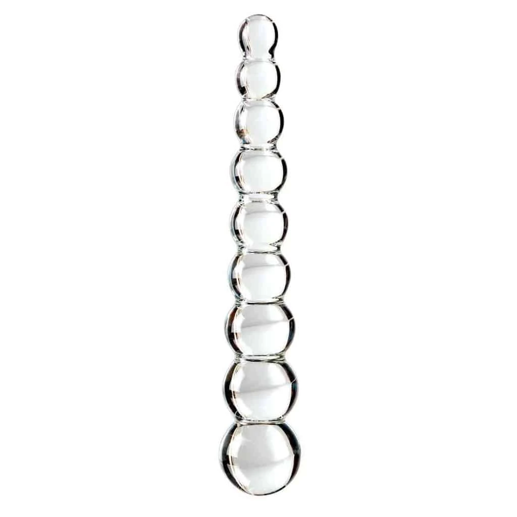 Wunderschöner Glas-Dildo in gerader Form mit 9 unterschiedlich großen Reizkugeln. Mundgeblasenes Qualitätsglas. Geruchsneutral, antiallergen und sehr hygienisch, da einfach zu reinigen, sogar in der Spülmaschine. Transparent. 22,5 cm lang, Ø 1,5 cm bis 3,7 cm.